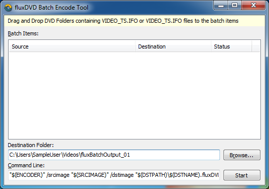 All you need to get started is to drop the VIDEO_TS directories you want to encode into the window, modify the destination folder and click “Start”. BatchEncodeTool will run the FluxEncoder with all folders you have dropped in until complete.