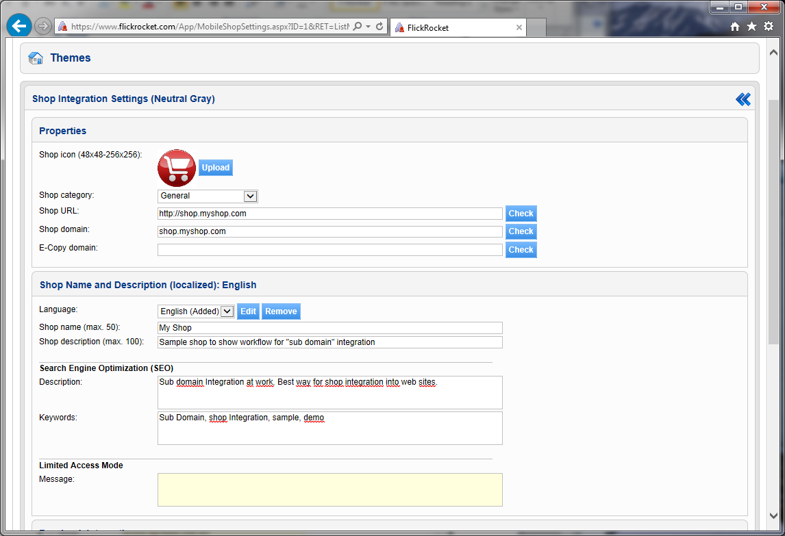 To finish the configuration, you need to login to the FlickRocket web interface and select Shop -> Themes -> Manage Integration and select the Theme you want to use.