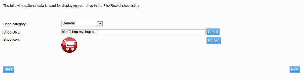 On the following step you should select a category for your shop, specify the URL for the shop (this time with preceding “https://”) and upload an icon for your shop.