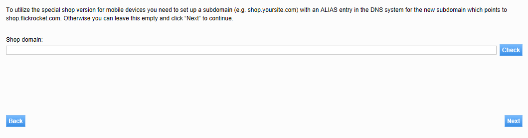 - 2.Create a C-NAME record (sometimes called ALIAS) for the newly created sub domain which points to “shop.flickrocket.com”.