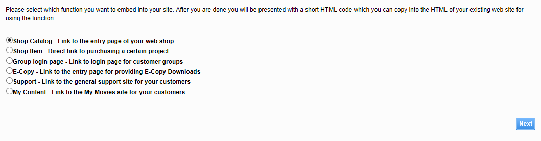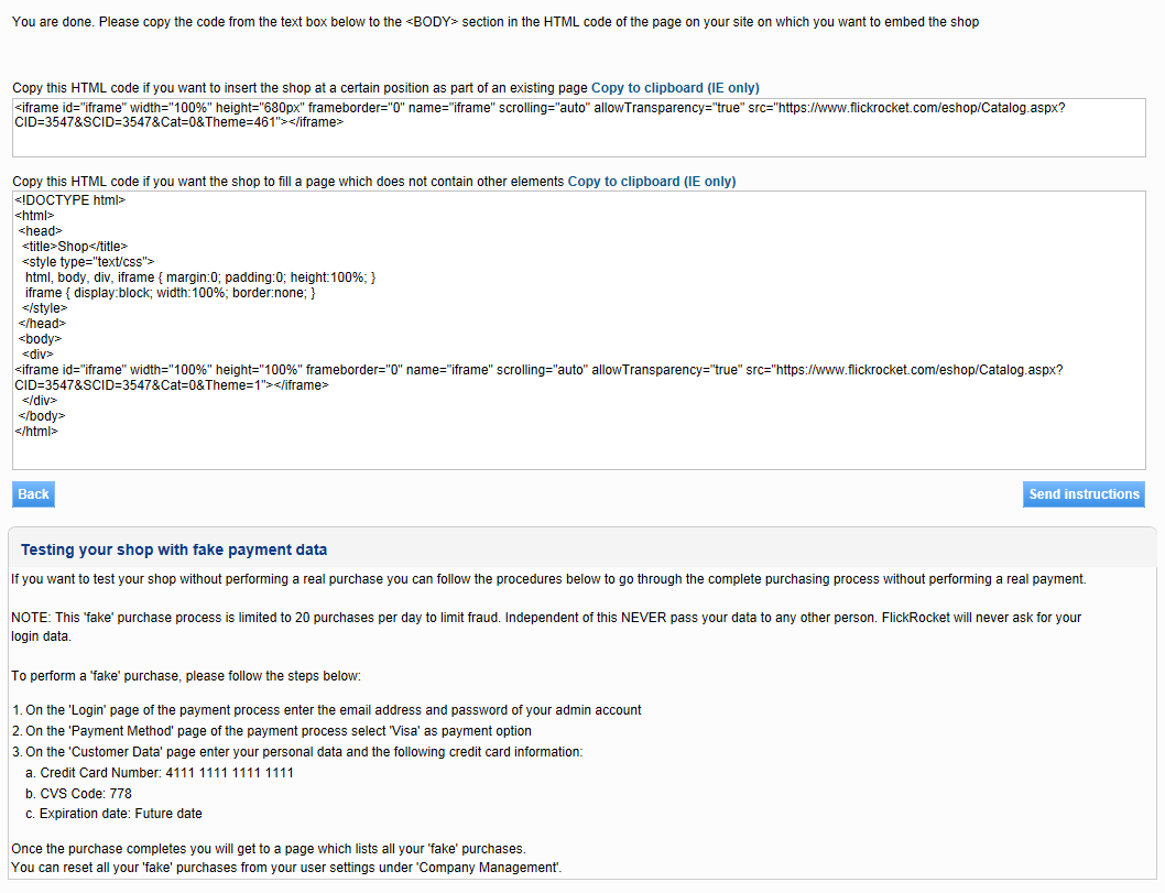 As you can see, you will get two different HTML code snippets. The first is in case you want to embed the shop in a certain section while the second is in case the shop should essentially fill the whole page.