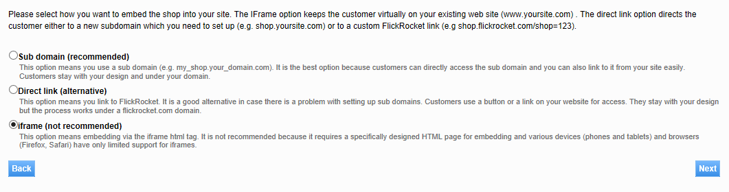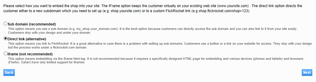 With the “direct link” option the users leaves the current web site and it directed to www.flickrocket.com. Of course your shop design will still be used, but the fact that the domain in the browser’s address bar changes will confuse some customers. It can hardly be accessed directly because the URL with parameters can’t be easily memorized. Bookmarking remains possible.