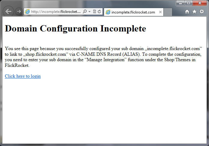 The last missing step is to set up the new sub domain correctly in the FlickRocket web interface. Until you do this, you will see a message like the following when you navigate with your browser to your newly created domain.
