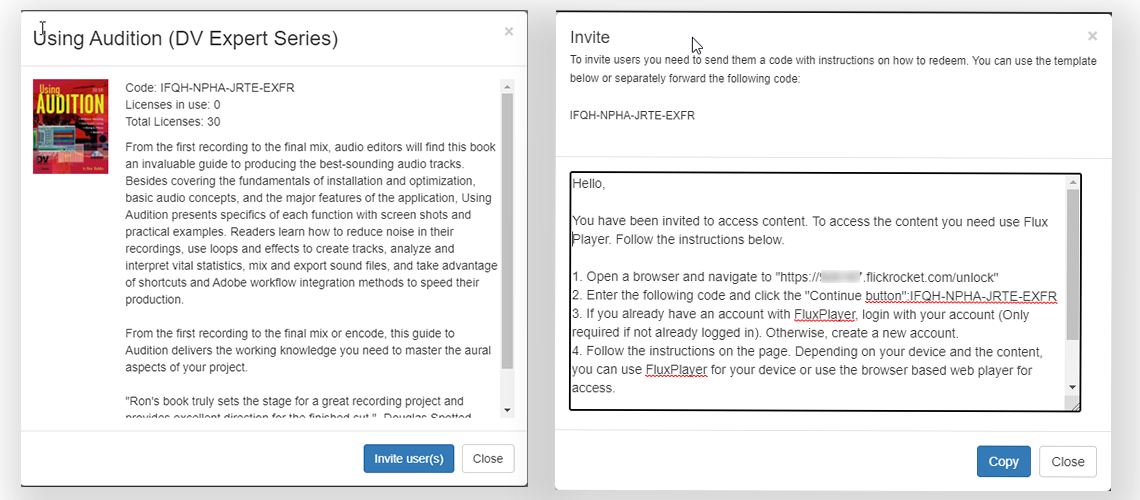 The Unlock Code is provided in the order confirmation email, but the customer can also find an email template with code and instructions that can be copied and forwarded by selecting the product on their My Content page and clicking the Invite Users button.