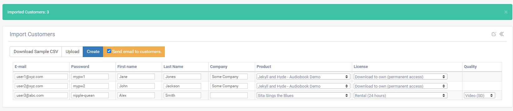 If you want to provide access to more than one product to the same customer, you can simply add another line with the same email address and a different product. The customer will have access to those products, but only one email will be sent.