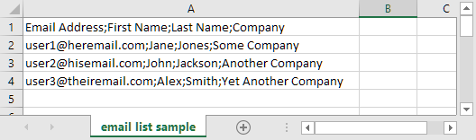 - Create .csv file with the fields email, First Name, Last Name, Company separate by semi-colons. Name and company are optional, but semi-colons are required if omitted. The header should be included. An example is as follows: